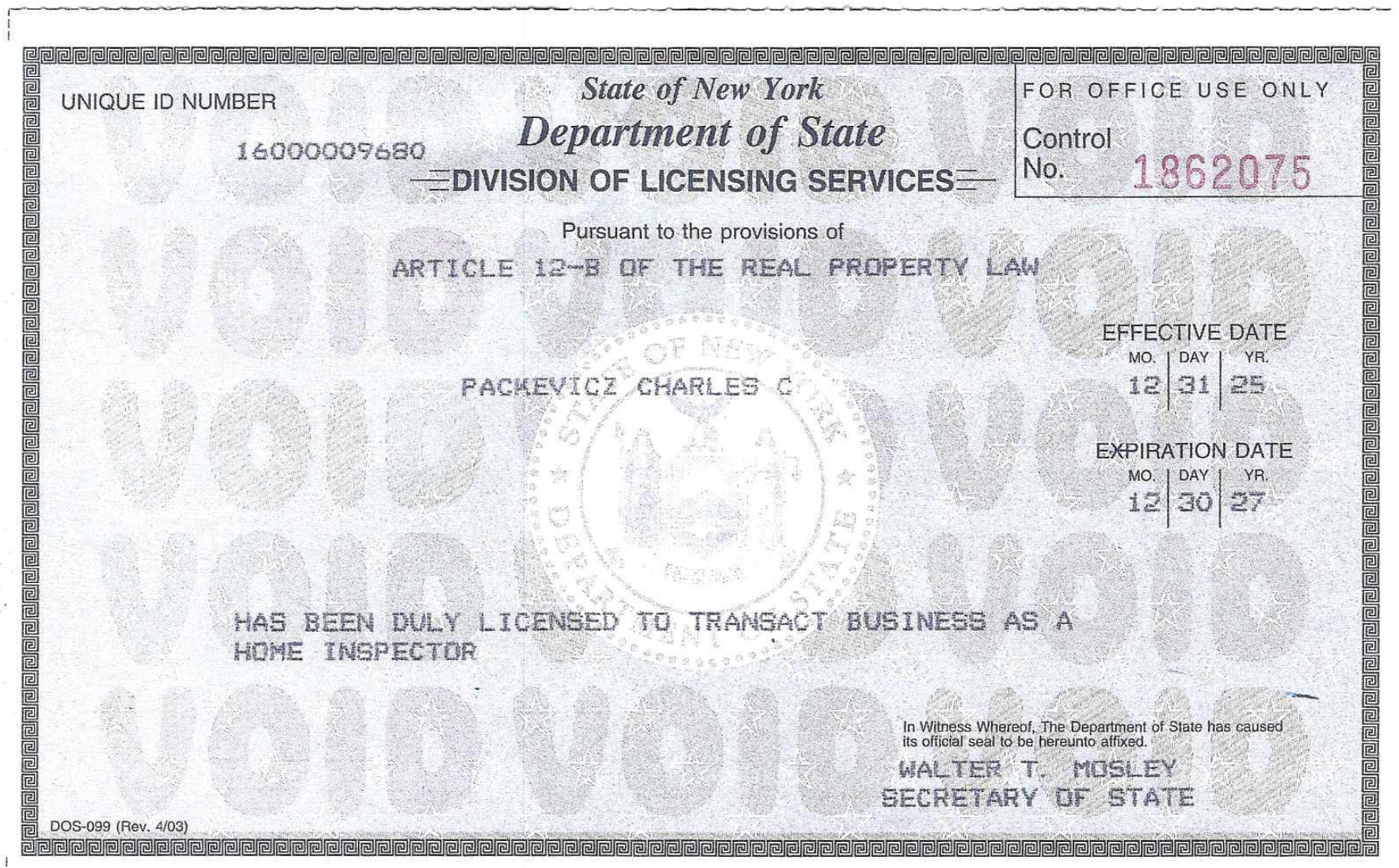 Chuck has been a structural inspector for over 50 years. Although no longer affiliated, by his own choice, he was a charter/founding member, certificate #42, of The American Society of Home Inspectors, and is currently a member of Internachi. He has received extensive architectural training throughout his career. He is licensed in all of the states in which he serves. He has, since 1968, inspected and issued written reports on well over 17,000 properties, both residential and commerical.